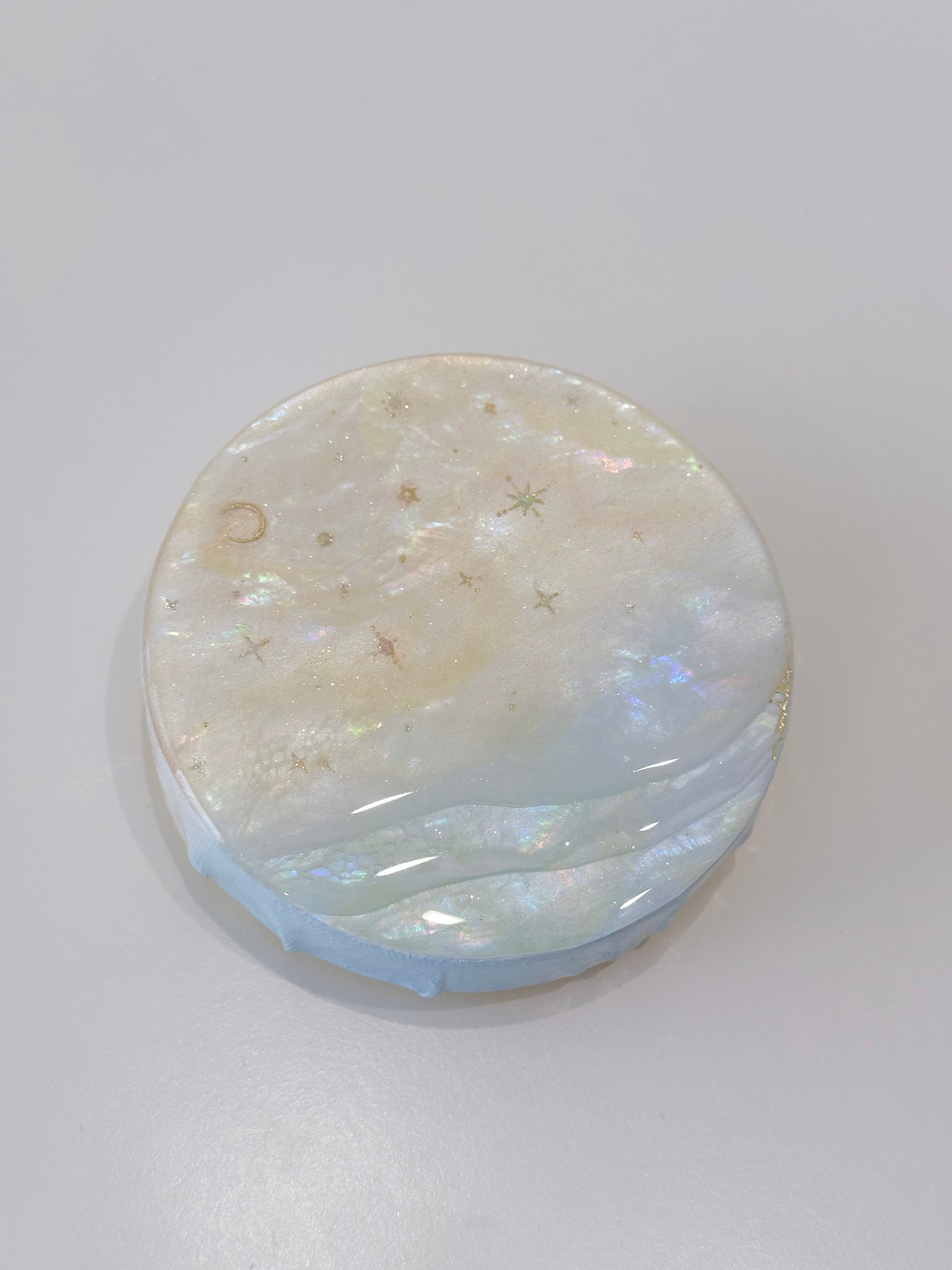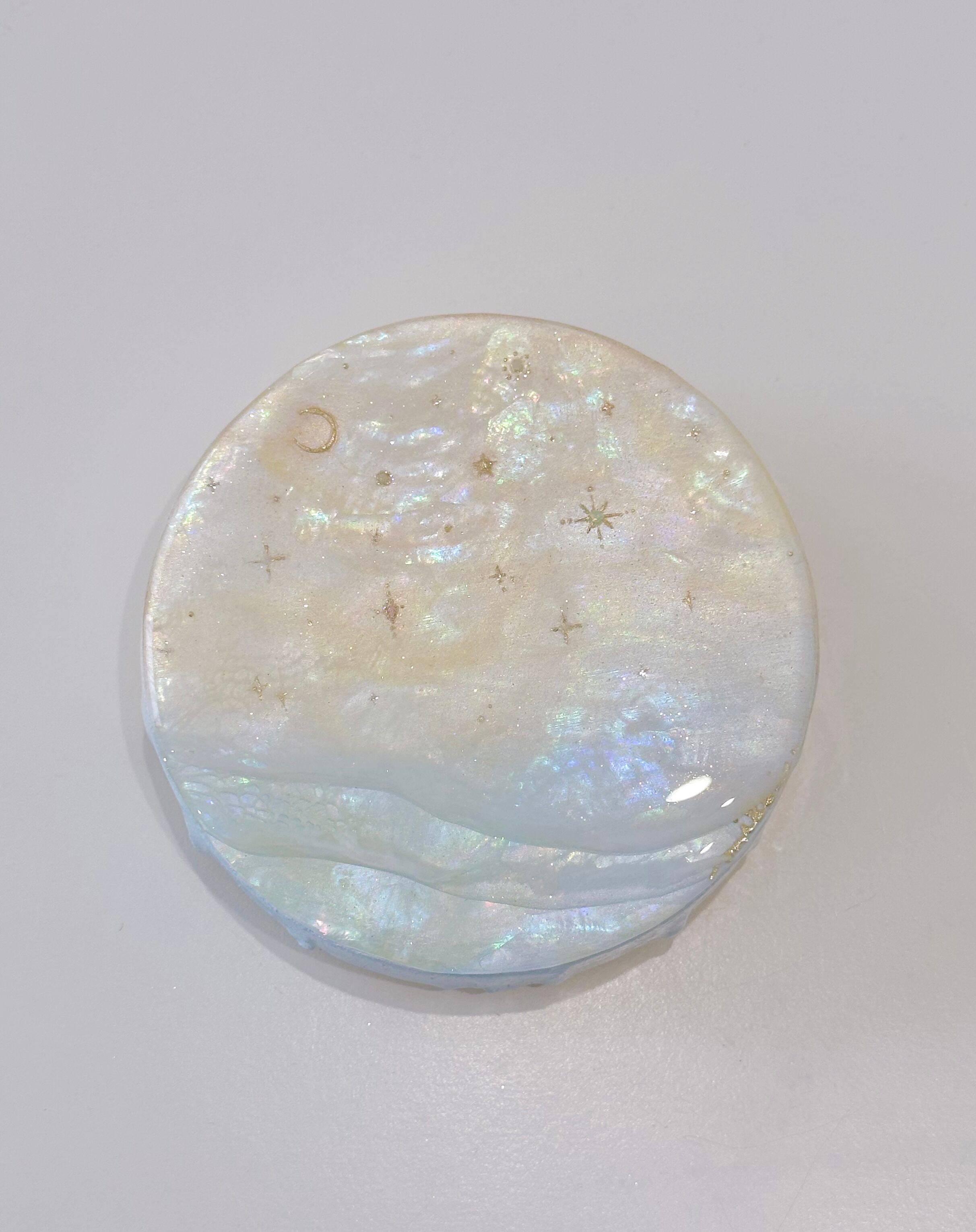 仕上げ:繊細なラメを何種類も入れた、レジンコーティングで透明感と奥行きを演出しています。