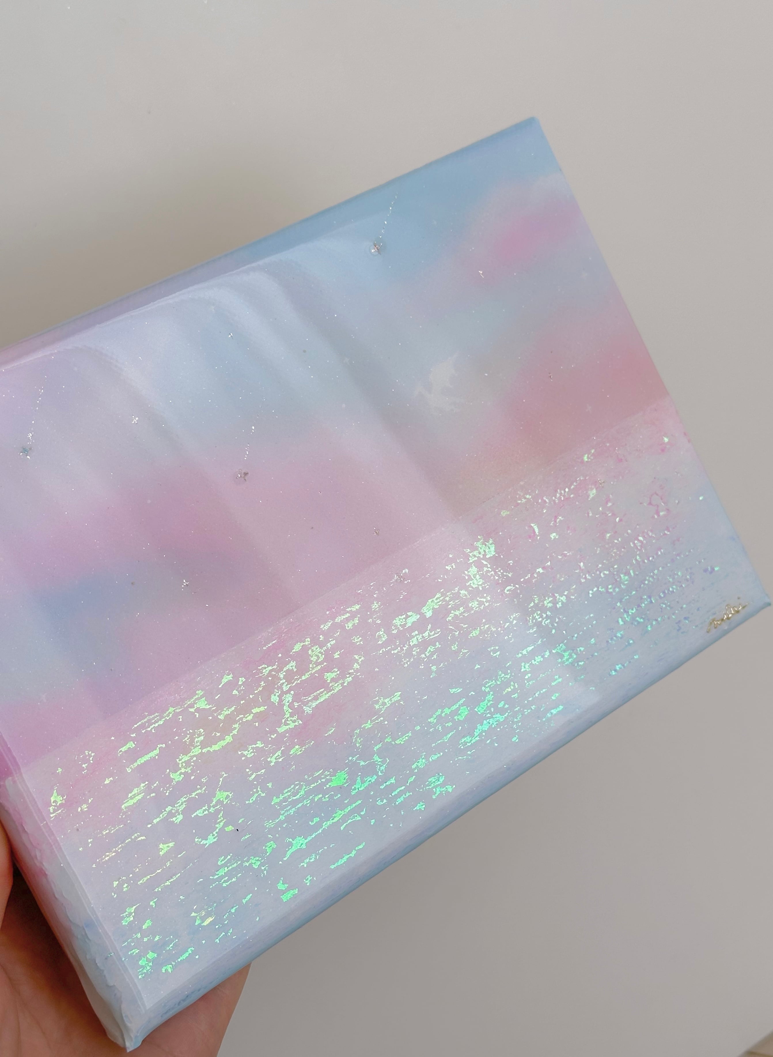 仕上げ:繊細なラメを何種類も入れた、レジンコーティングで透明感と奥行きを演出します。