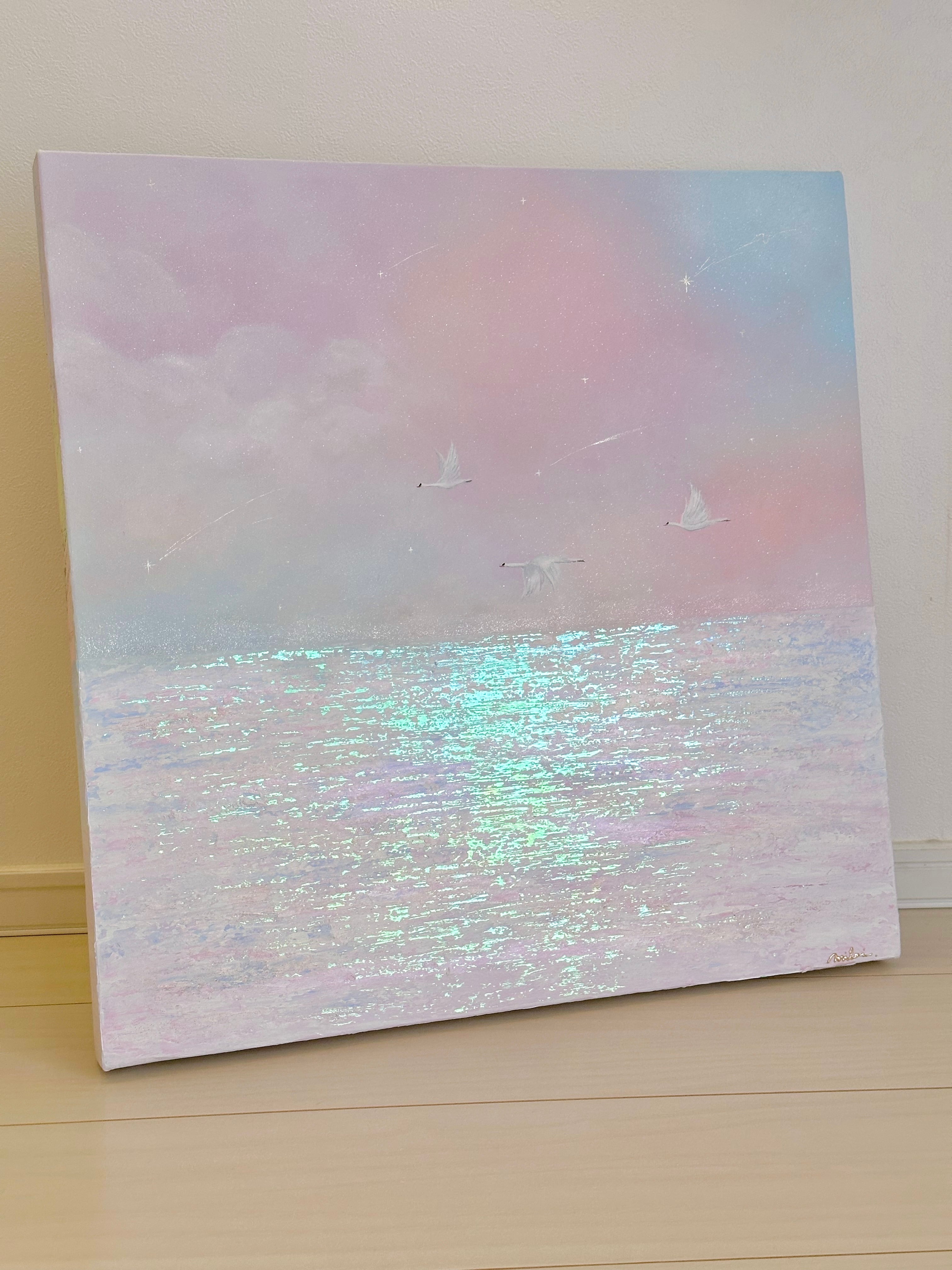 流れ星が舞う空の下、三羽の白鳥が未来へと羽ばたく姿を描いたこの作品は、私の中でも特別な想いを込めた大作です。